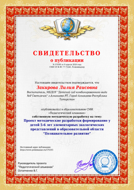 Закирова Лилия Раисовна Проект методические разработки формирование у детей 5-6 лет элементарных экологических представлений в образовательной области “Познавательное развитие” / Л. Р. Закирова. – Текст : электронный // Педагогический альманах : электронное СМИ. - URL: https://www.pedalmanac.ru/570395. - Дата публикации: 9 апреля 2026.