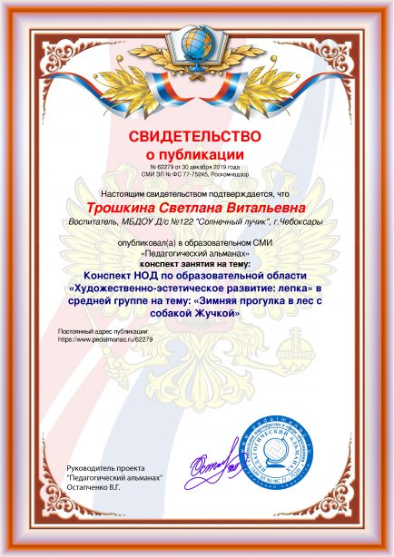 Трошкина, С. В. Конспект НОД по образовательной области «Художественно-эстетическое развитие: лепка» в средней группе на тему: «Зимняя прогулка в лес с собакой Жучкой» [Электронный ресурс] / Светлана Витальевна Трошкина // Педагогический альманах : [сайт]. - 2019. - 30 декабря. - [Россия]. - Режим доступа: https://www.pedalmanac.ru/62279, свободный. - Загл. с экрана.