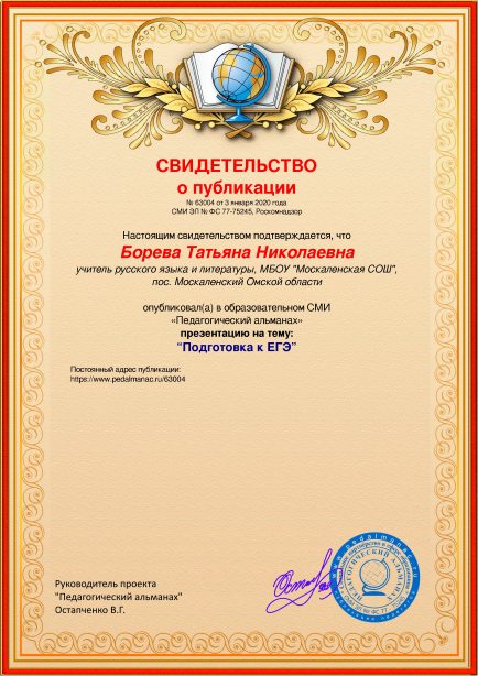 После оплаты Вам моментально предоставляется именное «Свидетельство о публикации» и «Справка о публикации материала в СМИ»В соответствии с пп. 36, 37 Приказа Минобрнауки РФ №276 «Об утверждении Порядка проведения аттестации педагогических работников» является подтверждением транслирования в педагогических коллективах опыта практических результатов своей профессиональной деятельности, в том числе экспериментальной и инновационной. установленного образца в печатном качестве, которые Вы можете приложить к портфолио и предъявить при прохождении аттестации.