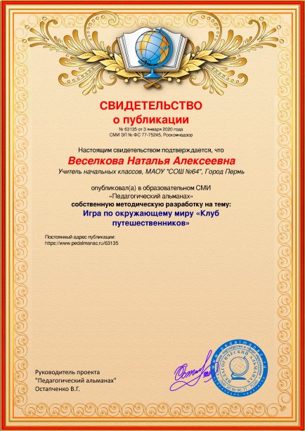 После оплаты Вам моментально предоставляется именное «Свидетельство о публикации» и «Справка о публикации материала в СМИ»В соответствии с пп. 36, 37 Приказа Минобрнауки РФ №276 «Об утверждении Порядка проведения аттестации педагогических работников» является подтверждением транслирования в педагогических коллективах опыта практических результатов своей профессиональной деятельности, в том числе экспериментальной и инновационной. установленного образца в печатном качестве, которые Вы можете приложить к портфолио и предъявить при прохождении аттестации.