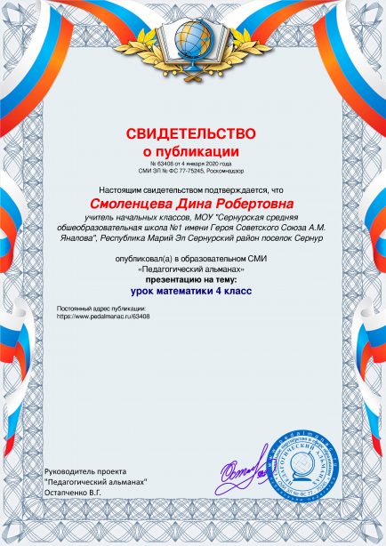 После оплаты Вам моментально предоставляется именное «Свидетельство о публикации» и «Справка о публикации материала в СМИ»В соответствии с пп. 36, 37 Приказа Минобрнауки РФ №276 «Об утверждении Порядка проведения аттестации педагогических работников» является подтверждением транслирования в педагогических коллективах опыта практических результатов своей профессиональной деятельности, в том числе экспериментальной и инновационной. установленного образца в печатном качестве, которые Вы можете приложить к портфолио и предъявить при прохождении аттестации.