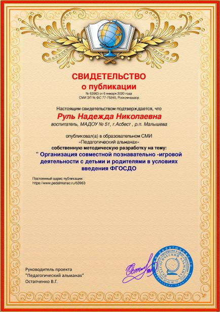 Руль Надежда Николаевна ” Организация совместной познавательно -игровой деятельности с детьми и родителями в условиях введения ФГОСДО / Н. Н. Руль. – Текст : электронный // Педагогический альманах : электронное СМИ. - URL: https://www.pedalmanac.ru/63963. - Дата публикации: 6 января 2020.