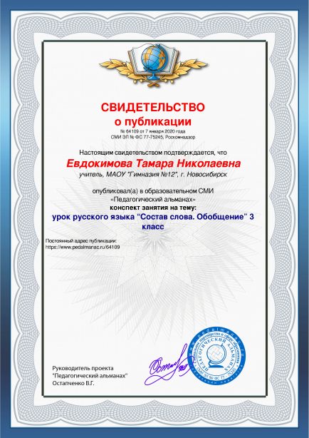 Евдокимова Тамара Николаевна урок русского языка “Состав слова. Обобщение” 3 класс / Т. Н. Евдокимова. – Текст : электронный // Педагогический альманах : электронное СМИ. - URL: https://www.pedalmanac.ru/64109. - Дата публикации: 7 января 2020.