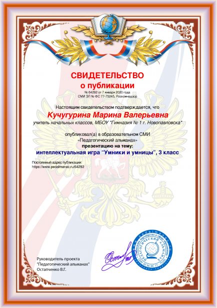 После оплаты Вам моментально предоставляется именное «Свидетельство о публикации» и «Справка о публикации материала в СМИ»В соответствии с пп. 36, 37 Приказа Минобрнауки РФ №276 «Об утверждении Порядка проведения аттестации педагогических работников» является подтверждением транслирования в педагогических коллективах опыта практических результатов своей профессиональной деятельности, в том числе экспериментальной и инновационной. установленного образца в печатном качестве, которые Вы можете приложить к портфолио и предъявить при прохождении аттестации.