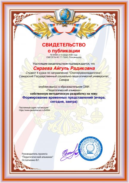 Сираева Айгуль Радиковна Формирование временных представлений (вчера, сегодня, завтра) / А. Р. Сираева. – Текст : электронный // Педагогический альманах : электронное СМИ. - URL: https://www.pedalmanac.ru/64594. - Дата публикации: 8 января 2020.