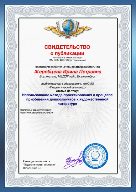 Жеребцева Ирина Петровна Использование метода проектирования в процессе приобщения дошкольников к художественной литературе / И. П. Жеребцева. – Текст : электронный // Педагогический альманах : электронное СМИ. - URL: https://www.pedalmanac.ru/64629. - Дата публикации: 8 января 2020.