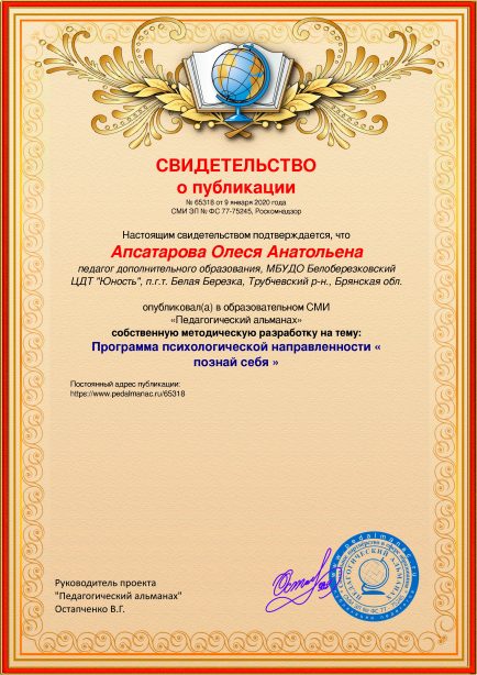 После оплаты Вам моментально предоставляется именное «Свидетельство о публикации» и «Справка о публикации материала в СМИ»В соответствии с пп. 36, 37 Приказа Минобрнауки РФ №276 «Об утверждении Порядка проведения аттестации педагогических работников» является подтверждением транслирования в педагогических коллективах опыта практических результатов своей профессиональной деятельности, в том числе экспериментальной и инновационной. установленного образца в печатном качестве, которые Вы можете приложить к портфолио и предъявить при прохождении аттестации.