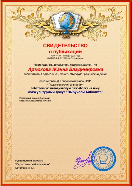Артюхова Жанна Владимировна Физкультурный досуг “Выручаем Айболита” / Ж. В. Артюхова. – Текст : электронный // Педагогический альманах : электронное СМИ. - URL: https://www.pedalmanac.ru/65371. - Дата публикации: 10 января 2020.