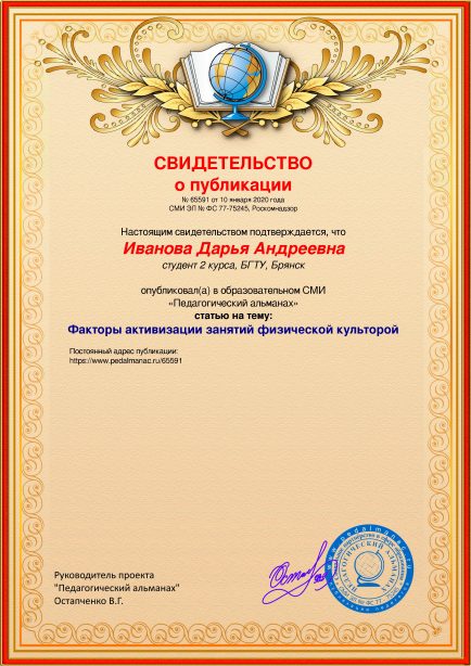 Иванова Дарья Андреевна Факторы активизации занятий физической культорой / Д. А. Иванова. – Текст : электронный // Педагогический альманах : электронное СМИ. - URL: https://www.pedalmanac.ru/65591. - Дата публикации: 10 января 2020.