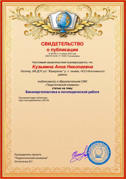 Кузьмина Анна Николаевна Биоэнергопластика в логопедической работе / А. Н. Кузьмина. – Текст : электронный // Педагогический альманах : электронное СМИ. - URL: https://www.pedalmanac.ru/65736. - Дата публикации: 10 января 2020.