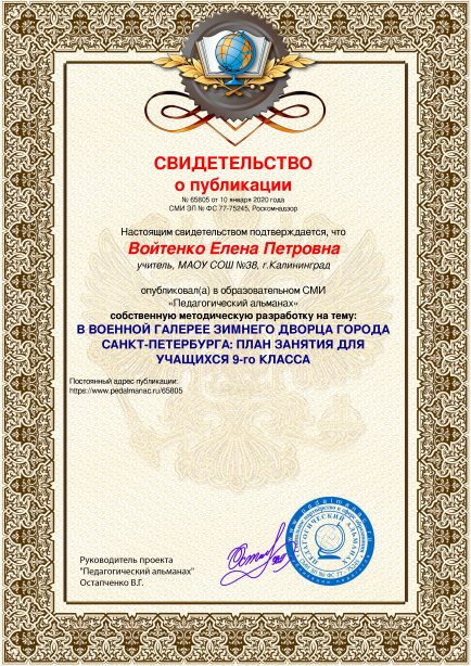 Войтенко Елена Петровна В ВОЕННОЙ ГАЛЕРЕЕ ЗИМНЕГО ДВОРЦА ГОРОДА САНКТ-ПЕТЕРБУРГА: ПЛАН ЗАНЯТИЯ ДЛЯ УЧАЩИХСЯ 9-го КЛАССА / Е. П. Войтенко. – Текст : электронный // Педагогический альманах : электронное СМИ. - URL: https://www.pedalmanac.ru/65805. - Дата публикации: 11 января 2020.