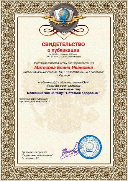 После оплаты Вам моментально предоставляется именное «Свидетельство о публикации» и «Справка о публикации материала в СМИ»В соответствии с пп. 36, 37 Приказа Минобрнауки РФ №276 «Об утверждении Порядка проведения аттестации педагогических работников» является подтверждением транслирования в педагогических коллективах опыта практических результатов своей профессиональной деятельности, в том числе экспериментальной и инновационной. установленного образца в печатном качестве, которые Вы можете приложить к портфолио и предъявить при прохождении аттестации.