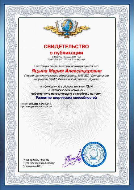 Яцына Мария Александровна Развитие творческих способностей / М. А. Яцына. – Текст : электронный // Педагогический альманах : электронное СМИ. - URL: https://www.pedalmanac.ru/66327. - Дата публикации: 13 января 2020.