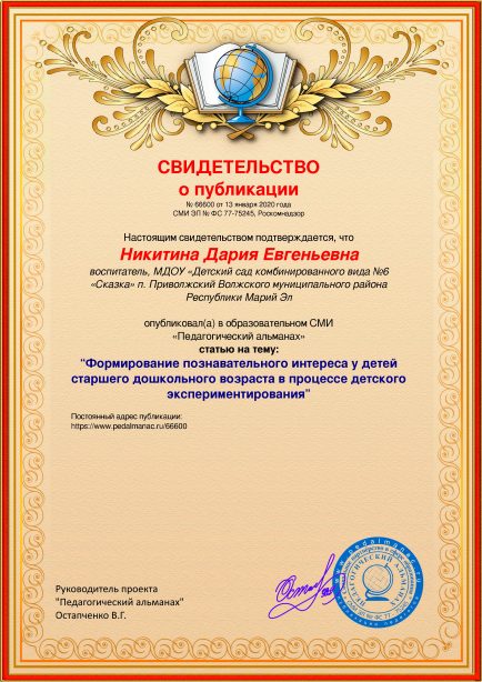 После оплаты Вам моментально предоставляется именное «Свидетельство о публикации» и «Справка о публикации материала в СМИ»В соответствии с пп. 36, 37 Приказа Минобрнауки РФ №276 «Об утверждении Порядка проведения аттестации педагогических работников» является подтверждением транслирования в педагогических коллективах опыта практических результатов своей профессиональной деятельности, в том числе экспериментальной и инновационной. установленного образца в печатном качестве, которые Вы можете приложить к портфолио и предъявить при прохождении аттестации.