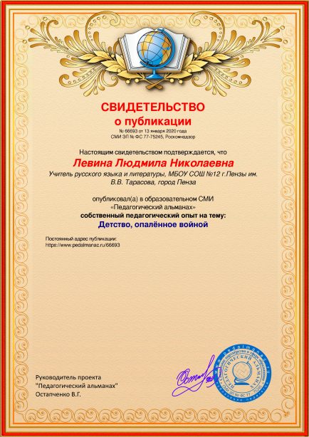 После оплаты Вам моментально предоставляется именное «Свидетельство о публикации» и «Справка о публикации материала в СМИ»В соответствии с пп. 36, 37 Приказа Минобрнауки РФ №276 «Об утверждении Порядка проведения аттестации педагогических работников» является подтверждением транслирования в педагогических коллективах опыта практических результатов своей профессиональной деятельности, в том числе экспериментальной и инновационной. установленного образца в печатном качестве, которые Вы можете приложить к портфолио и предъявить при прохождении аттестации.