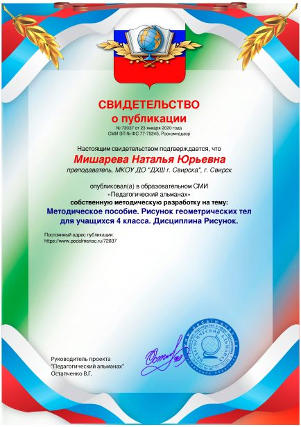 Мишарева Наталья Юрьевна Методическое пособие. Рисунок геометрических тел для учащихся 4 класса. Дисциплина Рисунок. / Н. Ю. Мишарева. – Текст : электронный // Педагогический альманах : электронное СМИ. - URL: https://www.pedalmanac.ru/72037. - Дата публикации: 23 января 2020.