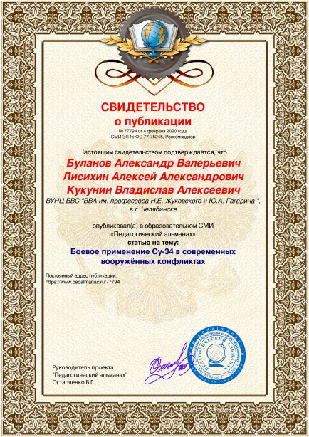 Буланов Александр Валерьевич Лисихин Алексей Александрович Кукунин Владислав Алексеевич Боевое применение Су-34 в современных вооружённых конфликтах / А. В. Буланов. – Текст : электронный // Педагогический альманах : электронное СМИ. - URL: https://www.pedalmanac.ru/77794. - Дата публикации: 4 февраля 2020.