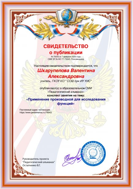 Шкарупелова Валентина Александровна «Применение производной для исследования функций» / В. А. Шкарупелова. – Текст : электронный // Педагогический альманах : электронное СМИ. - URL: https://www.pedalmanac.ru/79043. - Дата публикации: 7 февраля 2020.