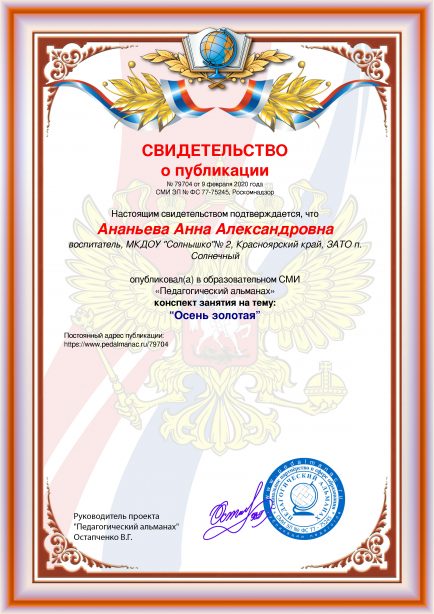 Ананьева Анна Александровна “Осень золотая” / А. А. Ананьева. – Текст : электронный // Педагогический альманах : электронное СМИ. - URL: https://www.pedalmanac.ru/79704. - Дата публикации: 9 февраля 2020.