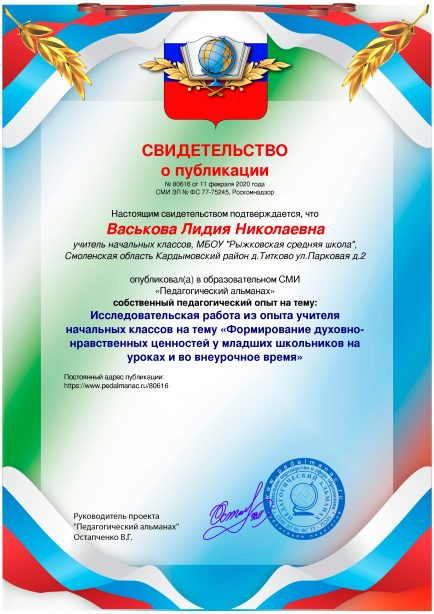 Васькова Лидия Николаевна Исследовательская работа из опыта учителя начальных классов на тему «Формирование духовно-нравственных ценностей у младших школьников на уроках и во внеурочное время» / Л. Н. Васькова. – Текст : электронный // Педагогический альманах : электронное СМИ. - URL: https://www.pedalmanac.ru/80616. - Дата публикации: 11 февраля 2020.