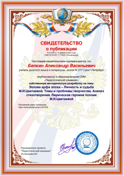 Белкин Александр Васильевич Эолова арфа эпохи – Личность и судьба М.И.Цветаевой. Темы и проблемы творчества. Анализ стихотворения. Лирическая героиня поэзии М.И.Цветаевой / А. В. Белкин. – Текст : электронный // Педагогический альманах : электронное СМИ. - URL: https://www.pedalmanac.ru/81035. - Дата публикации: 12 февраля 2020.