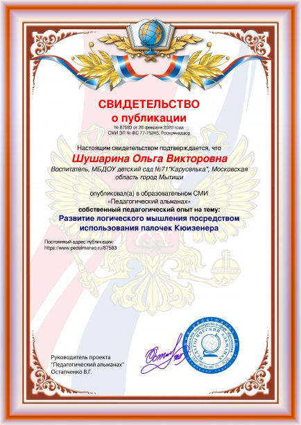 Шушарина Ольга Викторовна Развитие логического мышления посредством использования палочек Кюизенера / О. В. Шушарина. – Текст : электронный // Педагогический альманах : электронное СМИ. - URL: https://www.pedalmanac.ru/87583. - Дата публикации: 28 февраля 2020.