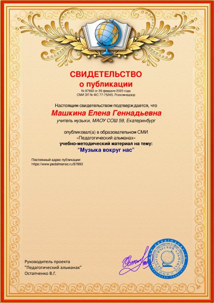 Машкина Елена Геннадьевна “Музыка вокруг нас” / Е. Г. Машкина. – Текст : электронный // Педагогический альманах : электронное СМИ. - URL: https://www.pedalmanac.ru/87892. - Дата публикации: 29 февраля 2020.