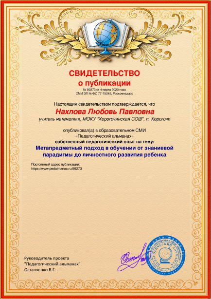 Нахлова Любовь Павловна Метапредметный подход в обучении от знаниевой парадигмы до личностного развития ребенка / Л. П. Нахлова. – Текст : электронный // Педагогический альманах : электронное СМИ. - URL: https://www.pedalmanac.ru/89273. - Дата публикации: 4 марта 2020.