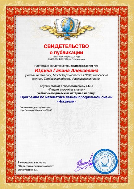 Юдина Галина Алексеевна Программа по математике летней профильной смены «Искатели» / Г. А. Юдина. – Текст : электронный // Педагогический альманах : электронное СМИ. - URL: https://www.pedalmanac.ru/89330. - Дата публикации: 4 марта 2020.